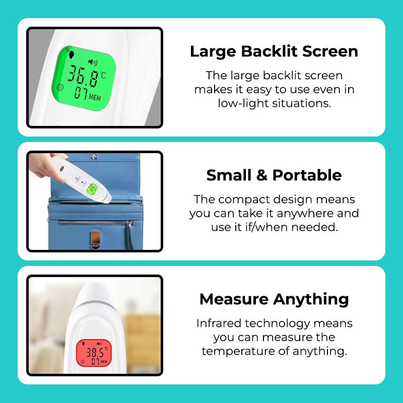 - Measure anything: Instantly check temperatures in any situation - ear, forehead, room, liquids, or even food - all without physical contact.